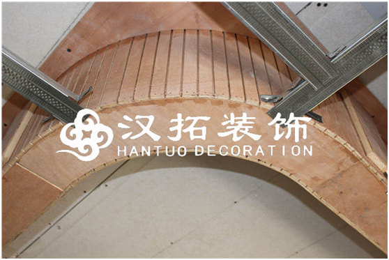 A、弧形或異形天花,用九厘板背面開(kāi)鋸路襯底,面罩3厘板。目的:造型順暢。