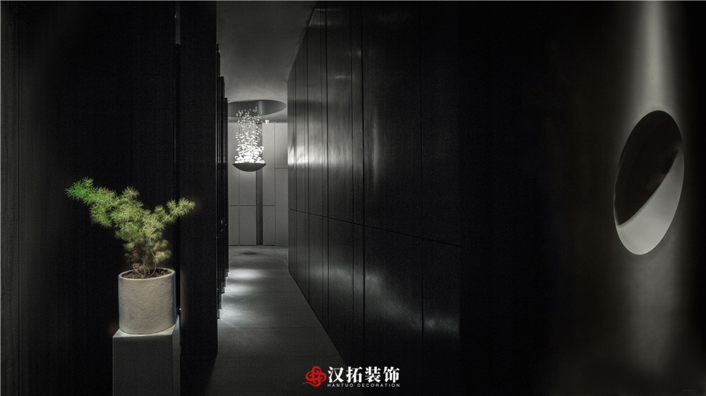 設(shè)計說明:為了突出空間的縱深感,從入口處這個位置開始,把視覺壓的很低,留出一點借景窗,引人進入到內(nèi)部空間,這里通過對比,黑白,高低設(shè)計體量的控制,通過這種平、框、曲、長,中國園林的手法,把整個空間該有的視覺若隱若現(xiàn)的控制在這里。