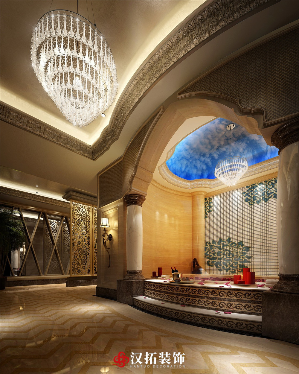 設(shè)計(jì)說明:將傳統(tǒng)元素與現(xiàn)代藝術(shù)表達(dá)完美統(tǒng)一,打造出舒適雅致的休閑場(chǎng)所。和諧的色彩搭配結(jié)合燈光設(shè)計(jì),金屬質(zhì)感的材質(zhì)和精致的紋路的演繹,在凸顯典雅氣質(zhì)的同時(shí),給人放松、自在的休閑空間,暢享人生之悅。