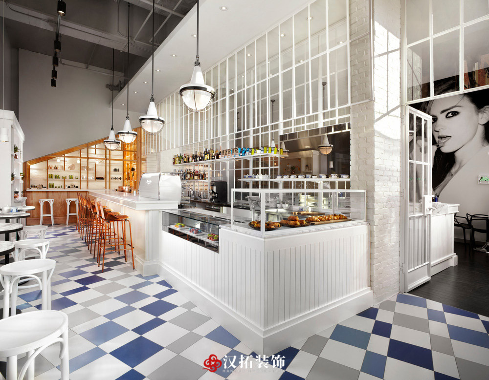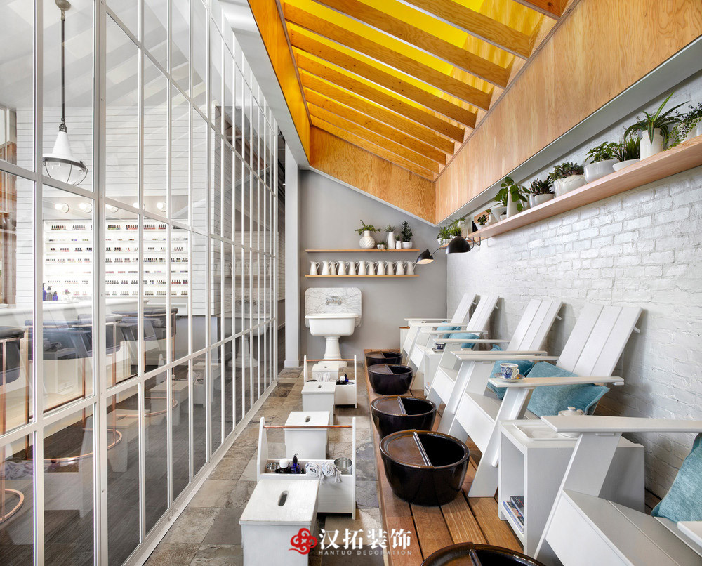 設(shè)計(jì)說(shuō)明:店鋪內(nèi)的主色調(diào)選擇比較輕快明了的色彩,頂部使用大面積的明黃,使得空間更加跳躍活潑,增加通透感,店內(nèi)工具擺放整齊,干凈又美觀。