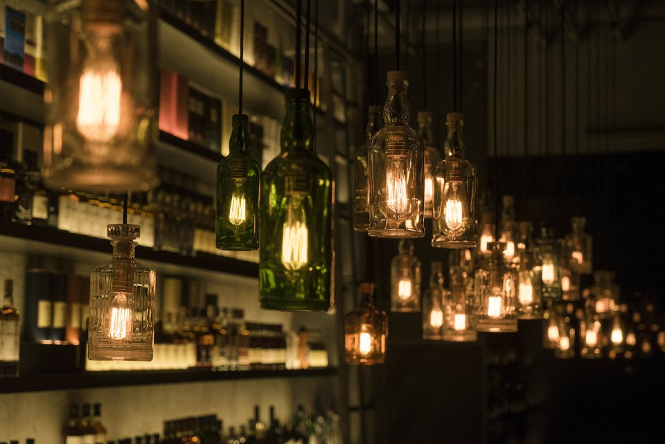 裝修理念:該酒店由南京漢拓裝飾裝修設(shè)計(jì)。設(shè)計(jì)師對(duì)于酒店的裝修設(shè)計(jì)十分用心,一邊是難能可見(jiàn)的各類特殊藏酒,一邊是十米高的酒墻,各類威士忌酒琳瑯滿目。吧臺(tái)上方一排用各類威士忌酒瓶改造的吊燈,琳瑯滿目,燈泡、鎢絲閃閃發(fā)光,通過(guò)玻璃折射出魅惑的光。