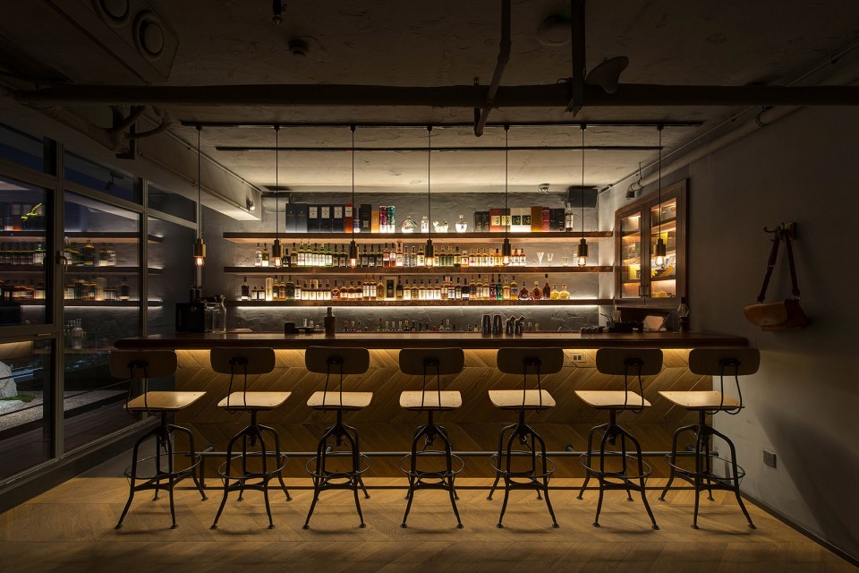 設(shè)計(jì)說(shuō)明:設(shè)計(jì)師對(duì)于酒店的裝修設(shè)計(jì)十分用心,一邊是難能可見(jiàn)的各類特殊藏酒,一邊是十米高的酒墻,各類威士忌酒琳瑯滿目。吧臺(tái)上方一排用各類威士忌酒瓶改造的吊燈,琳瑯滿目,燈泡、鎢絲閃閃發(fā)光,通過(guò)玻璃折射出魅惑的光。