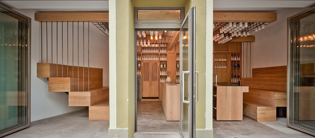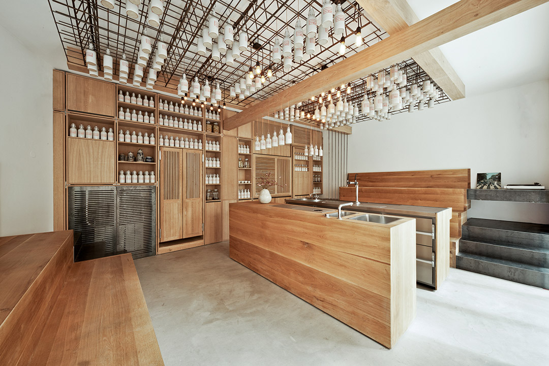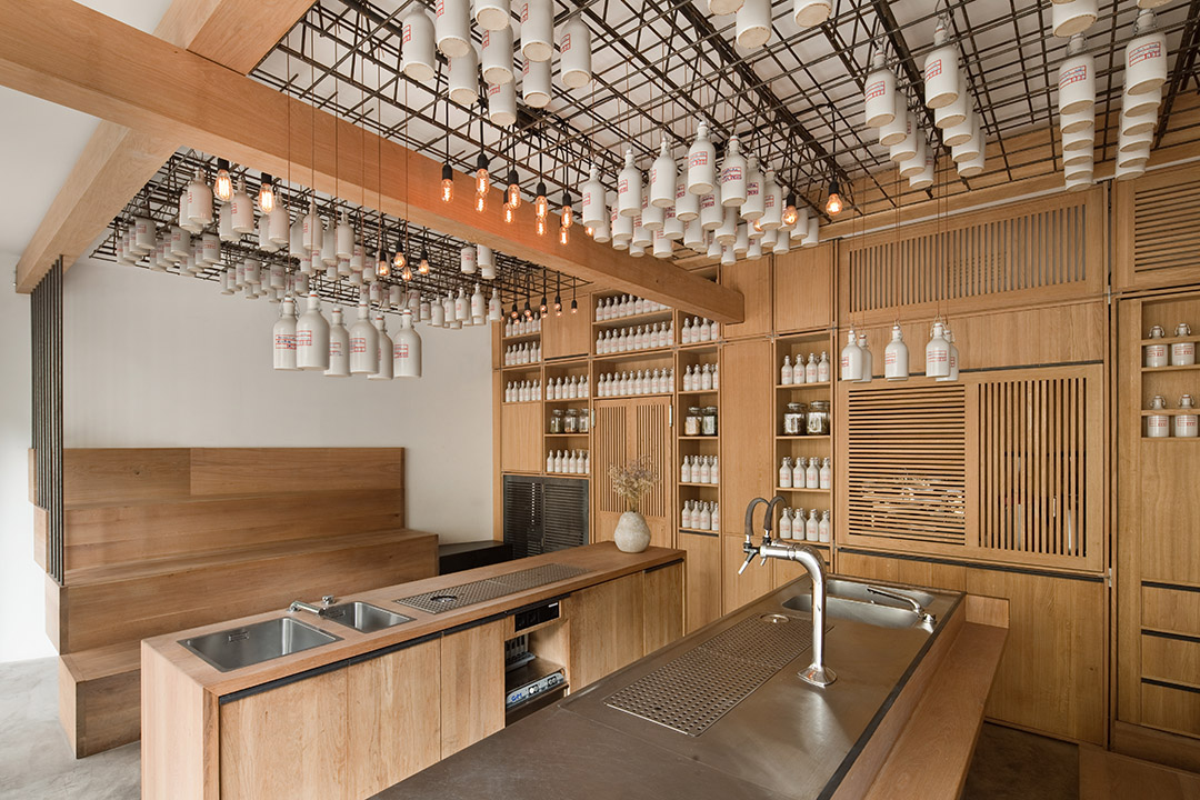 設計說明:兩側(cè)靠墻的部位是類似圓形劇場的長椅,這樣消除了一般酒吧內(nèi)調(diào)酒師和客人之間的界限。在這里,互動交流變得十分重要,座椅上的每個人都可以清晰地觀看中心兩個吧臺區(qū)混合、搖動和攪拌雞尾酒的過程。
