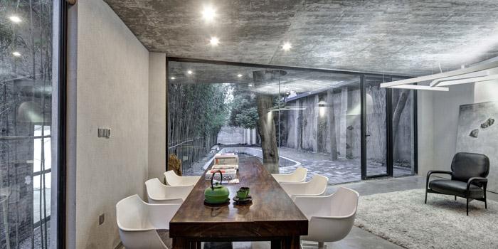 裝修理念:基地本身極為局促,三向面墻,只有一個方向朝向一個有水池的后院,同時整個建筑對空間的索取也因為現(xiàn)有的一顆大樹而受到很大限制,而設(shè)計的結(jié)果也表現(xiàn)為一種綜合了封閉與開敞、占有與妥協(xié)、趣味空間與邏輯建造等多種復(fù)雜關(guān)系之后的一種和諧。整個建筑貼合基地空間,平面布局呈現(xiàn)為一個邏輯關(guān)系模糊的四邊形,卻也因此獲得了對空間的最大索取。整個建筑在布局上分為三部分,朝向后院一側(cè)布置相對公共性的開敞空間,一層茶室,二層圖書室,同時在二層圖書室伸出一個三角型的小平臺將現(xiàn)存樹木加以包裹,使得樹木和建筑本身融為一體。而背向后院一側(cè)布置休息室,書房以及輔助服務(wù)空間等相對私密的空間;公共空間與私密空間之間通過一個趣味性的連接空間得以串連。