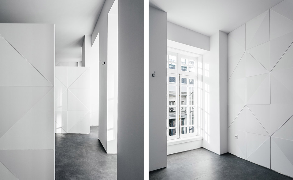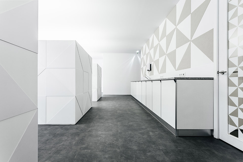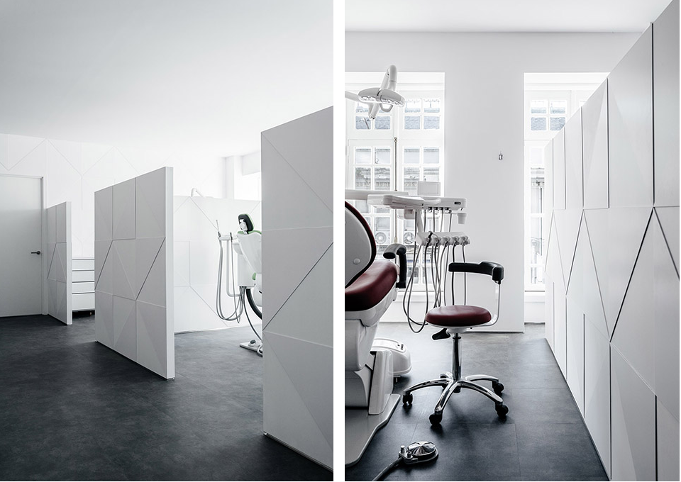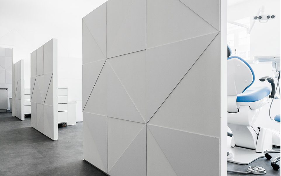 設計說明:項目中的幾何圖案被運用在墻壁,家具,照明和門板上。采用三種材料詮釋:石膏板墻,PVC面板以及波雷爾毛紡織物–其可以運用在墻面上當吸聲板。在等待室,照明燈具也融于墻面的圖案,此外房間中的等候長椅也運用了設計中的三角形特色元素。一道印有設計圖案的門隔開了等候室和診療場所,進入診療場所,四個治療位被低隔斷分割,剩下一個治療位因為采用X射線系統(tǒng)而被墻壁完全的分割。此外還有一個辦公室,工作室,更衣室,以及浴室。