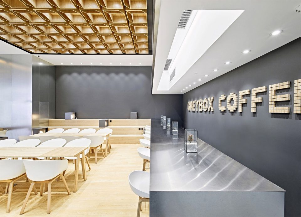 設(shè)計(jì)說明:設(shè)計(jì)師結(jié)合了業(yè)主的理念,試圖用設(shè)計(jì)的手法來制造一種“喝咖啡的儀式感”。不同于一般的咖啡廳那種濃烈的小資情調(diào),東緹咖啡廳是有自己的特殊企業(yè)理念的,東緹的負(fù)責(zé)人希望咖啡也能喝出儀式感,希望一杯咖啡,從開磨到?jīng)_泡到制作,到最終呈現(xiàn)在食客的面前,都是標(biāo)準(zhǔn)化的、工業(yè)化的、可視化的一個(gè)過程。做咖啡的過程就如同身處實(shí)驗(yàn)室,因此,漢拓設(shè)計(jì)師對(duì)于該咖啡廳的設(shè)計(jì)首先從燈光入手,并沒有采用其他咖啡廳昏暗燈光配慢搖的風(fēng)格,而是給予了明亮的射燈造型,讓制造咖啡的每一個(gè)過程都清晰無比的得以呈現(xiàn),也體現(xiàn)了企業(yè)標(biāo)準(zhǔn)化的訴求。
