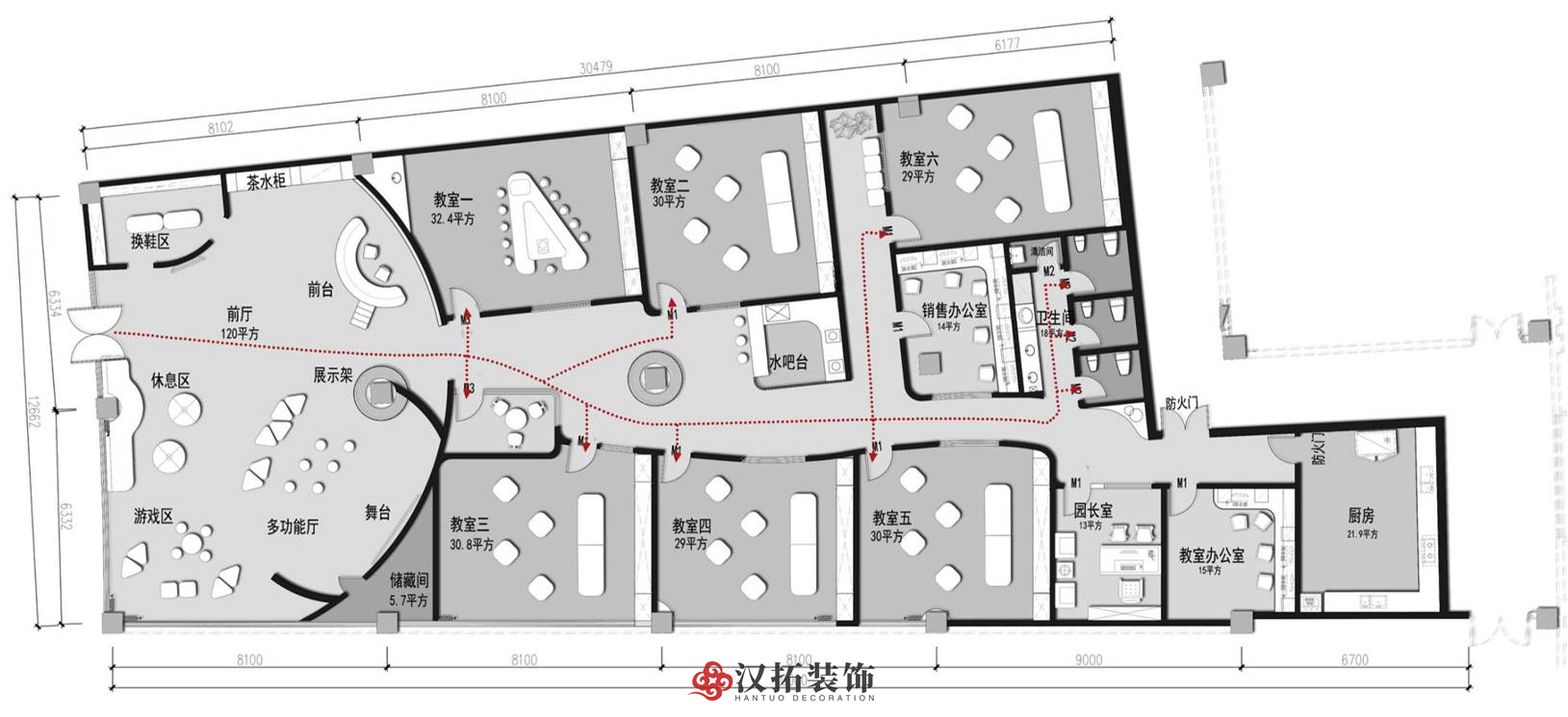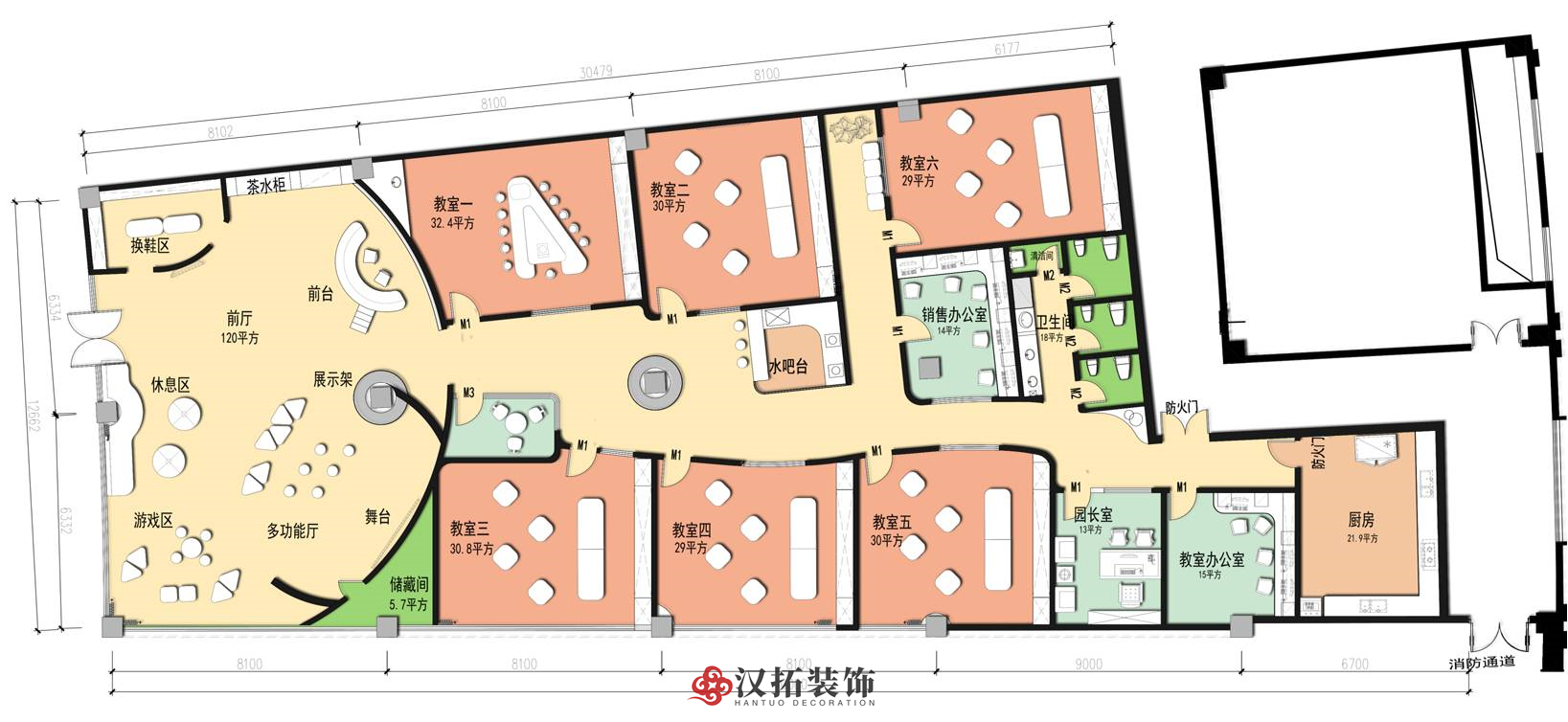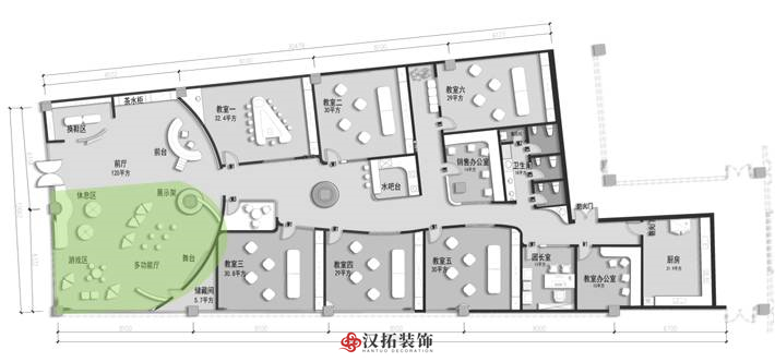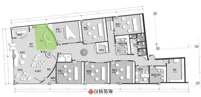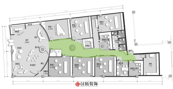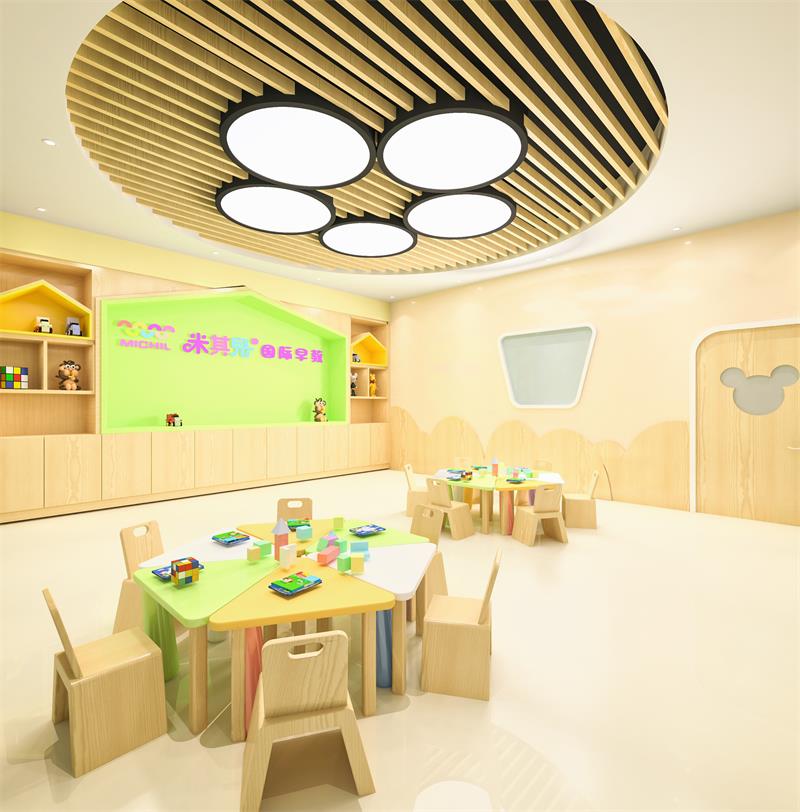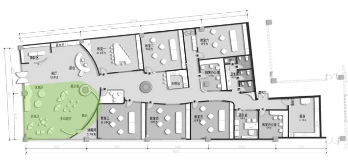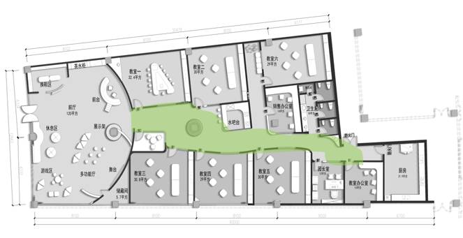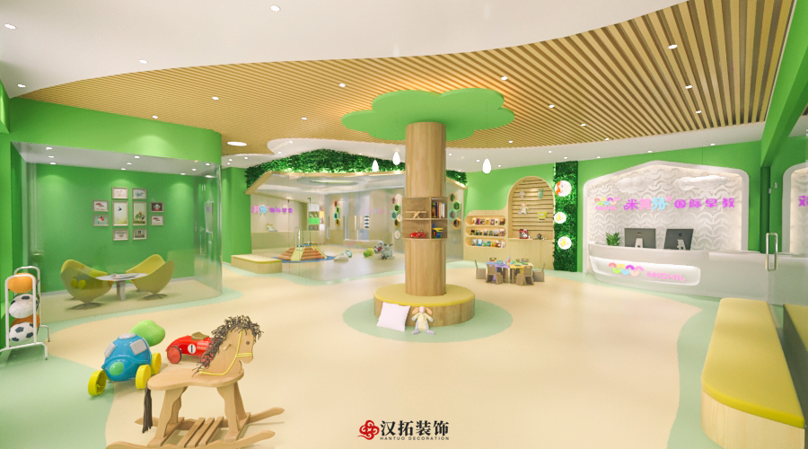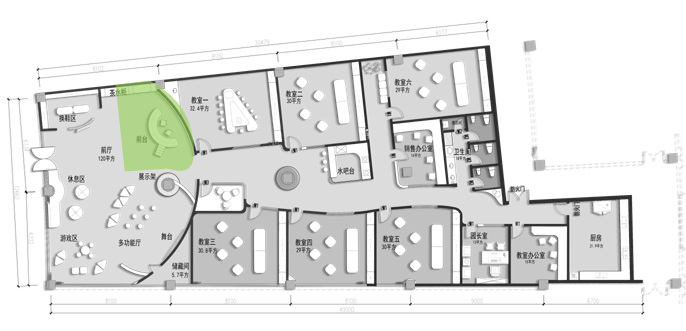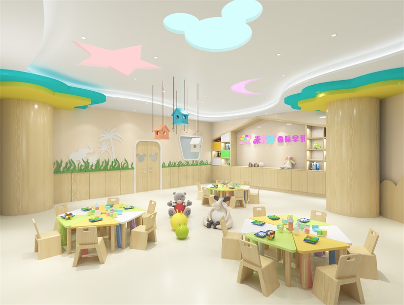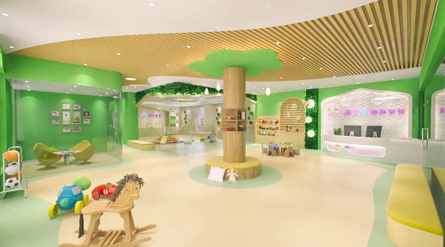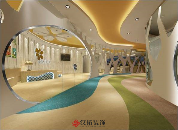 前廳120平,增加小舞臺區(qū),家長或路過的群眾在門外就能看到園方的兒童或親子表演,增加人氣。我們把通道做成異形,擯棄傳統(tǒng)的方正規(guī)矩,顯得格外與眾不同,因為是總店,對空間是有一定要求的,一定要做到與其他園區(qū)的差異性,對品牌宣傳,對招生都是有利的。這點園長也非常認(rèn)同我們,最終達成一致的合作意向。