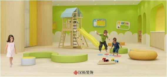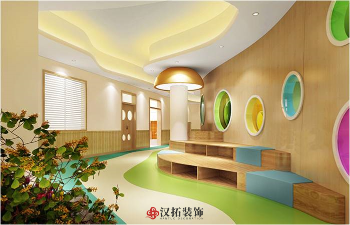 過道的設(shè)計突破傳統(tǒng),異形空間,給孩子神秘感,蜿蜒曲折讓孩子的探秘童心迸發(fā)出來,地面地膠與頂面石膏板吊頂造型協(xié)調(diào)統(tǒng)一,使不規(guī)則的空間也顯得錯落有致。